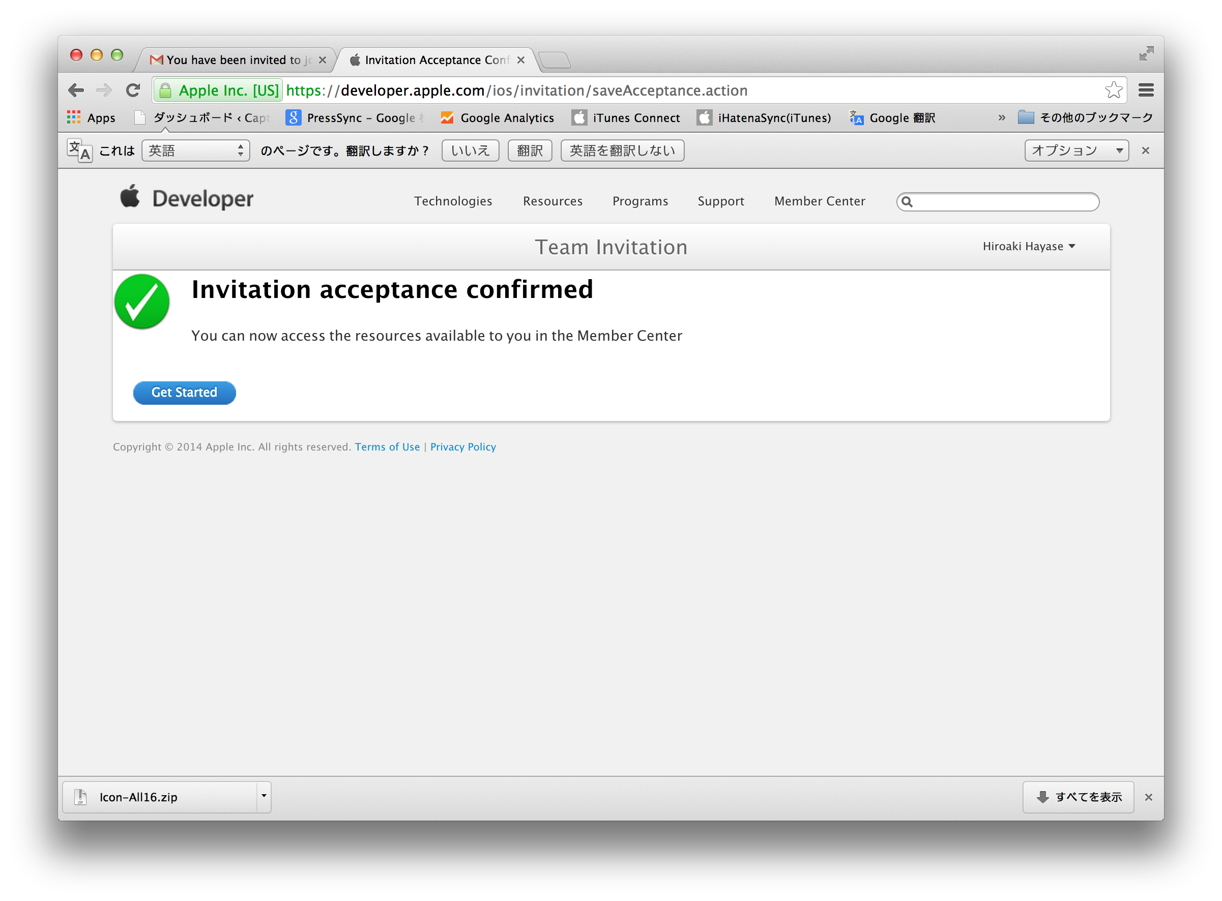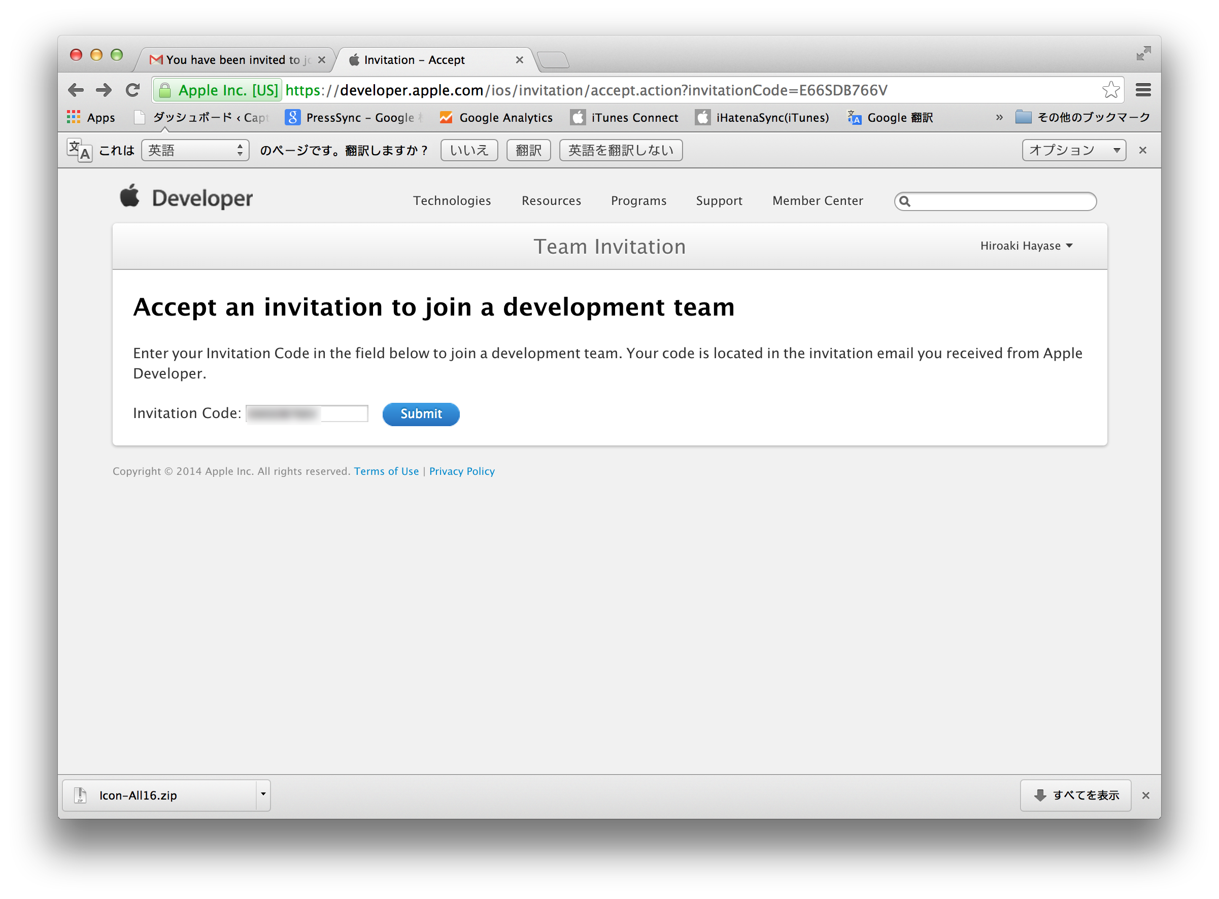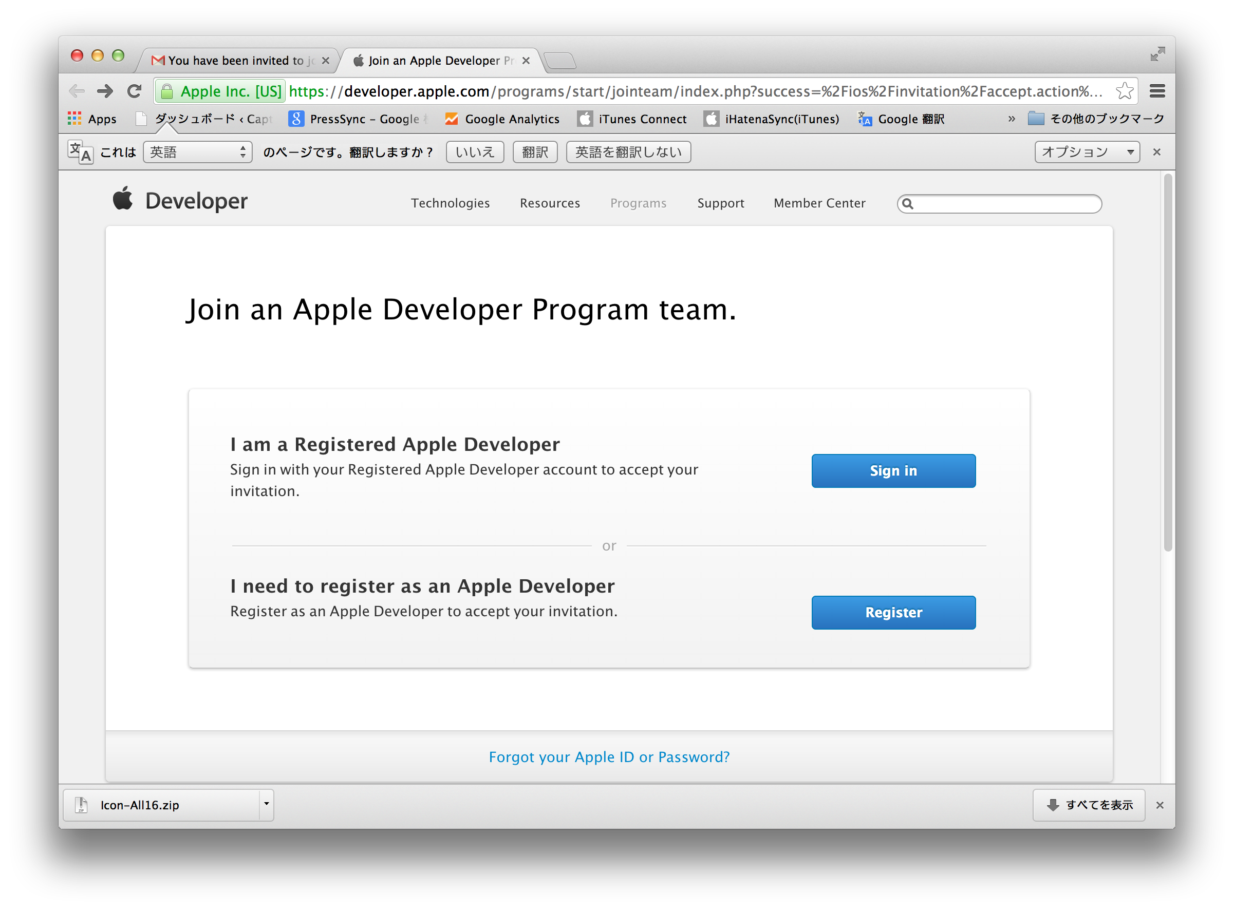 インビテーションを開くと、ログインまたはApple Devlopper Programへの登録を促されます。私は自分の個人アカウントでサインイン。