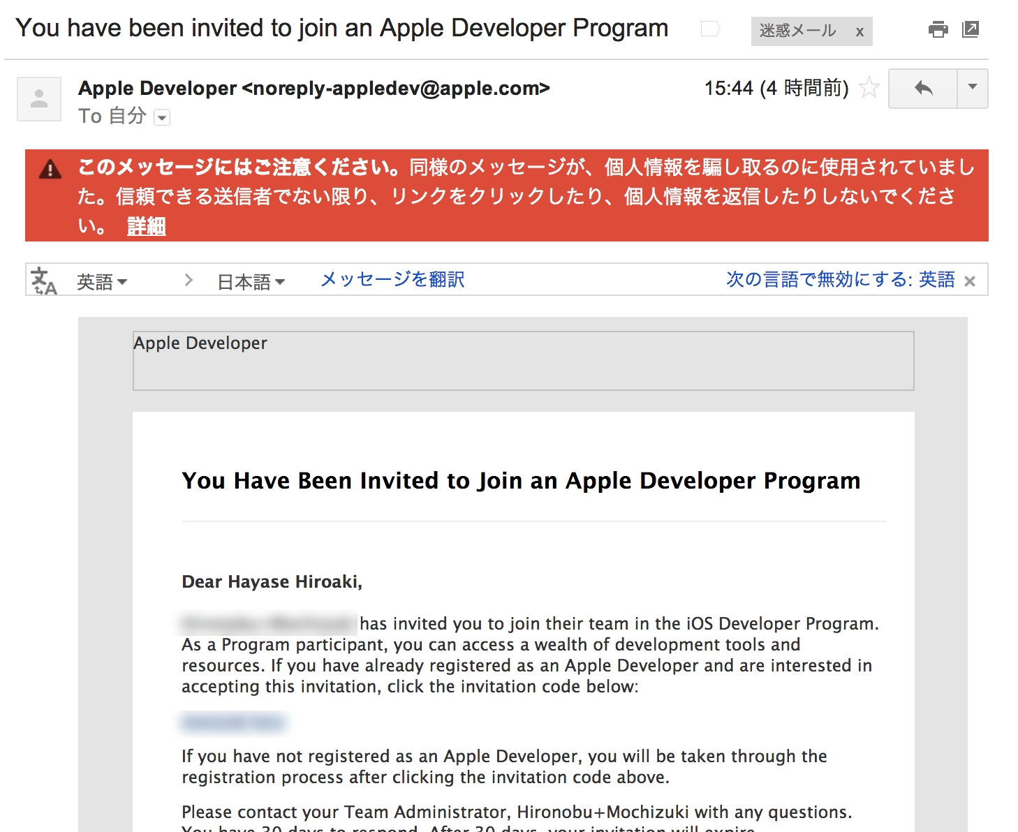 GmailはApple Devlopper Programからのメールを迷惑メールと見做すもよう。これマジ注意。