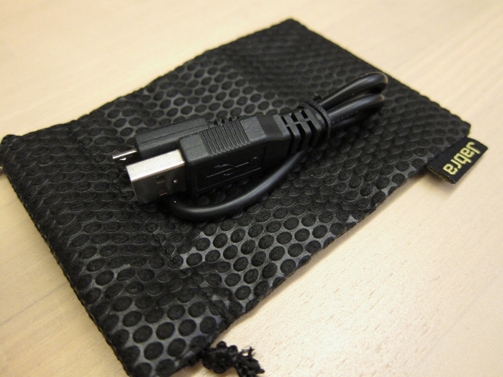 専用ポーチと充電ケーブルが付属しています。専用ポーチが付いてるのは嬉しいんですけど、前述したようにJabra ROXは結構大きいので綺麗に収納するのは結構難しかったりします。