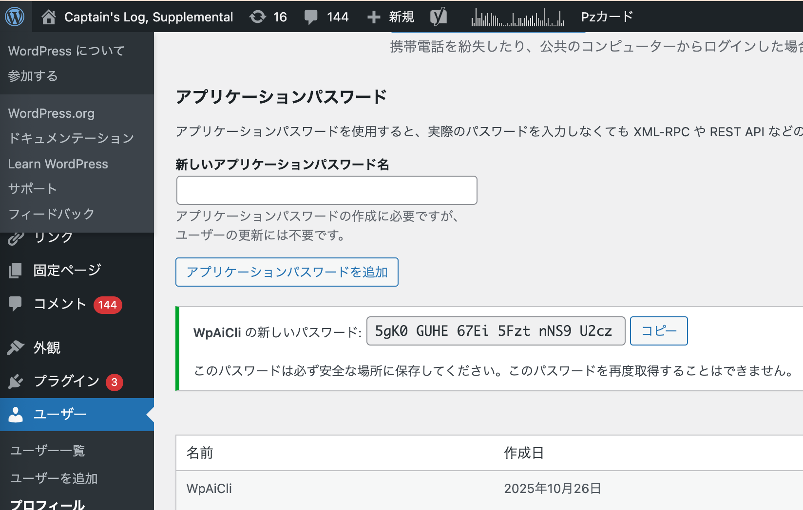 WpAiCliなど分かりやすい名前を入力し、「新しいアプリケーションパスワードを追加」をクリックします。 - 生成されたパスワード(例: